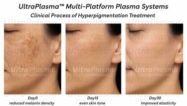 Hyperpigmentation refers to the excessive darkening of the skin due to increased melanin production or deposition. It includes conditions such as melasma, solar lentigines, and post-inflammatory hyperpigmentation (PIH). Traditional treatments—topicals, chemical peels, and laser therapy—often fall short due to limited penetration, inflammation risk, or relapse. UltraPlasma™, a multi-platform plasma device, employs arc, argon, and helium modalities to precisely target melanin-rich layers, improve cell turnover, and remodel extracellular matrix via gas-mediated pathways.