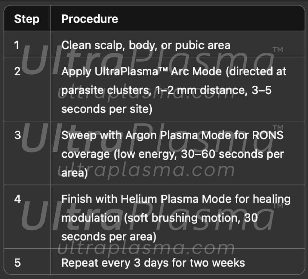 Pediculosis, caused by Pediculus humanus capitis (head lice), Pediculus humanus corporis (body lice), and Phthirus pubis (pubic lice), remains a widespread public health issue globally. Traditional chemical treatments have faced challenges due to increasing resistance and skin toxicity. UltraPlasma™ multi-platform plasma systems — integrating arc plasma, argon plasma, and helium plasma technologies — offer a novel, non-chemical approach to eradicate lice and their nits while promoting scalp and skin healing. Plasma-induced reactive oxygen and nitrogen species (RONS), including ozone (O₃), nitric oxide (NO), and singlet oxygen (¹O₂), play a pivotal role in parasitic destruction, inflammation modulation, and tissue regeneration. This article comprehensively reviews the mechanisms of action, skin layer interactions, and clinical implications of UltraPlasma™ treatment in pediculosis management.